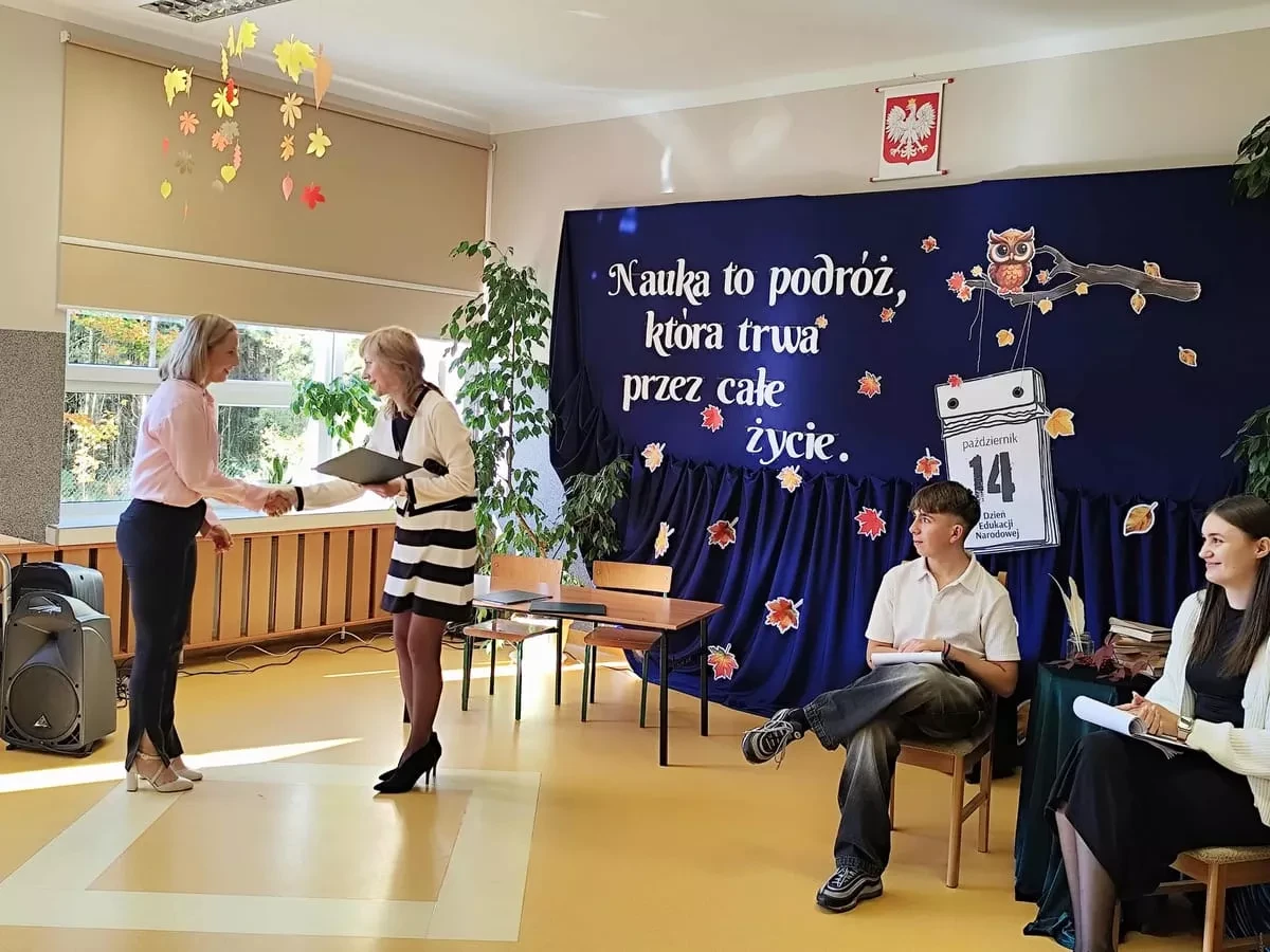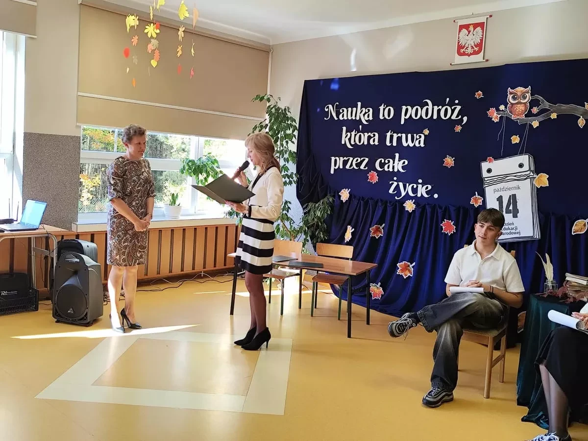 Po zakończeniu części artystycznej głos zabrała Pani Dyrektor, która skierowała do zebranych serdeczne słowa uznania i podziękowania za codzienną pracę, zaangażowanie oraz troskę o rozwój uczniów. W swoim wystąpieniu podkreśliła znaczenie współpracy całej społeczności szkolnej i rolę, jaką każdy z jej członków odgrywa w kształtowaniu młodych pokoleń.