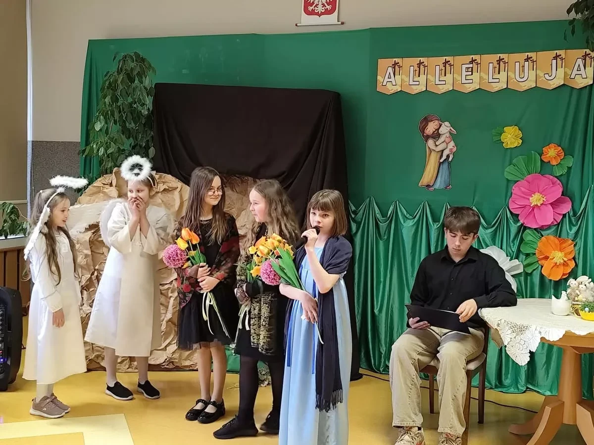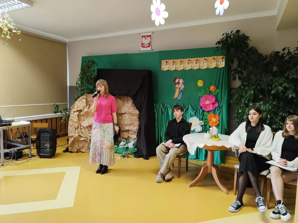 W dniu 1 kwietnia 2026 roku w naszej szkole odbył się uroczysty apel z okazji Świąt Wielkanocnych. Wydarzenie miało charakter zarówno religijny, jak i świecki - uczniowie zaprezentowali program artystyczny nawiązujący do tradycji i symboliki świąt, a także zwyczajów związanych z pisankami i wielkanocnymi obrzędami.